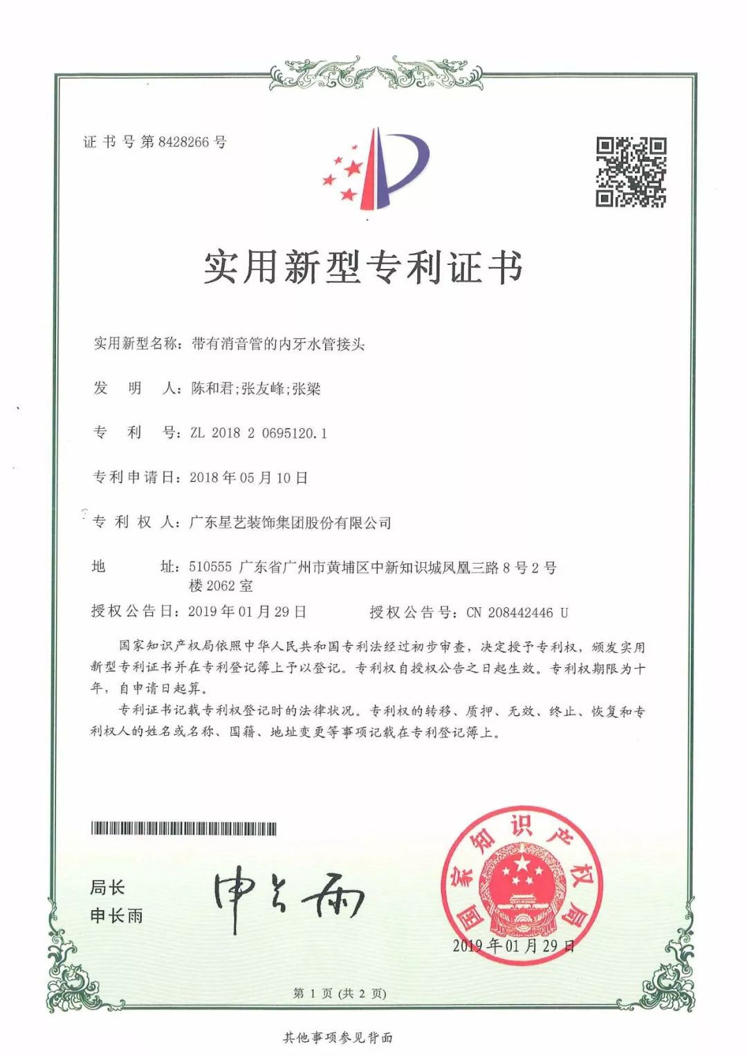 近日,星藝集團(tuán)取得了“帶有消音管的內(nèi)牙水管接頭”實(shí)用新型專利,并獲得了由國(guó)家知識(shí)產(chǎn)權(quán)局頒發(fā)的專利證書。