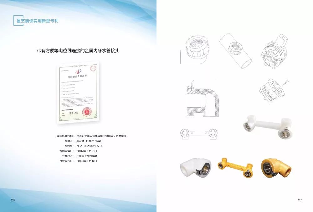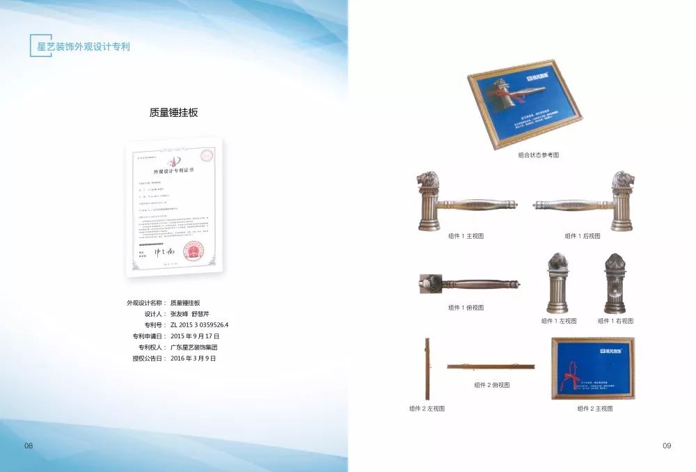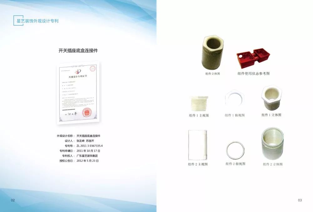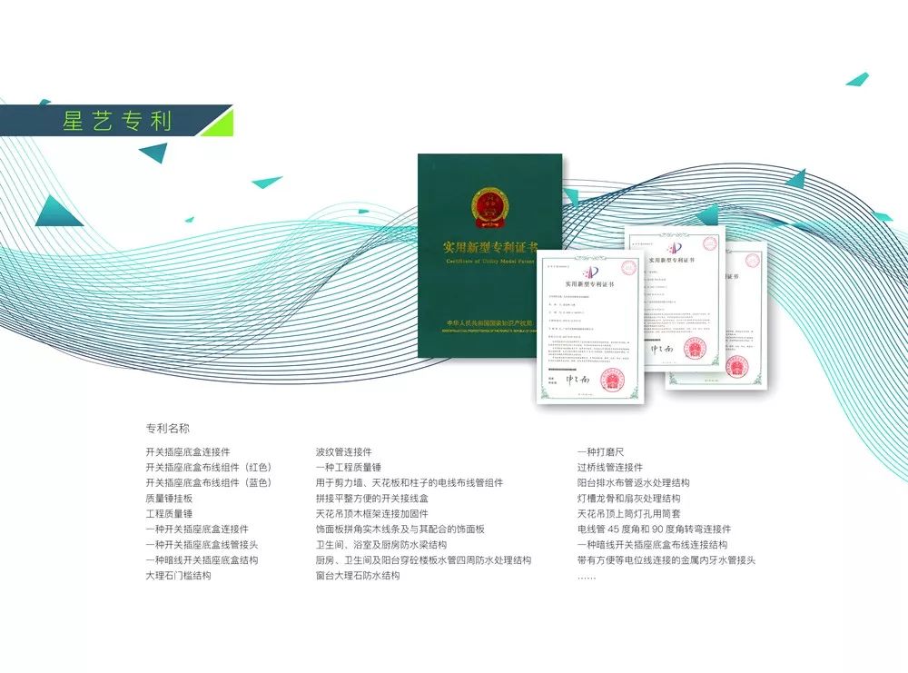 《星藝裝飾專利手冊(cè)》收集了星藝裝飾研發(fā)的幾十項(xiàng)國(guó)家實(shí)用新型專利和外觀設(shè)計(jì)專利。