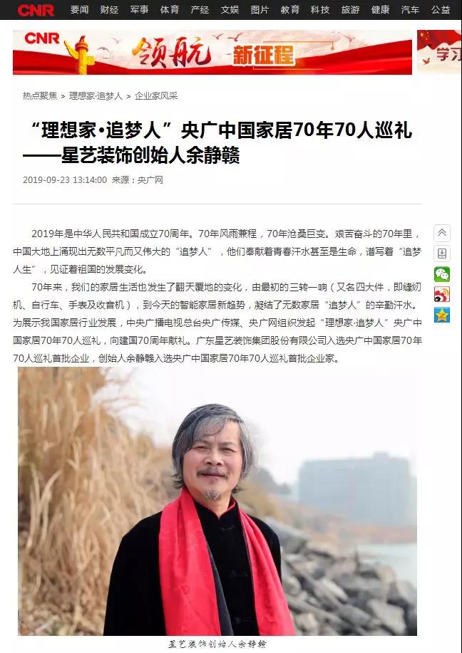 星藝裝飾入選央廣中國(guó)家居70年70人巡禮首批企業(yè)