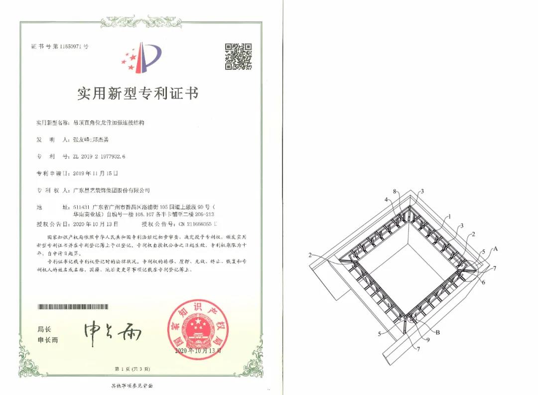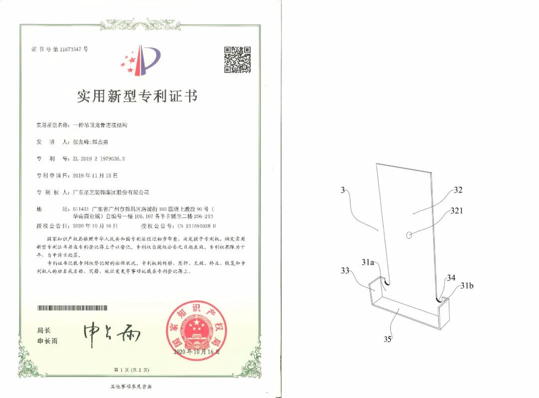 近日,星藝裝飾集團取得“吊頂直角位龍骨加強連接結構”、“一種吊頂龍骨連接結構”實用新型專利,并獲得由國家知識產權局頒發(fā)的專利證書。