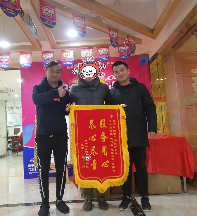 2018年12月,榮和千千樹業(yè)主送來錦旗,稱贊設計師易昆、范珀菸專業(yè)設計,監(jiān)理周平楊服務用心,盡心盡責。南寧星藝裝飾全員會繼續(xù)以虔誠、熱情、體貼的態(tài)度和更加務實、求精、利他的行動,將“讓每一位客戶滿意”的服務標桿,提升到“讓每一位客戶感動”的新高度,讓客戶省心、省時、省力!