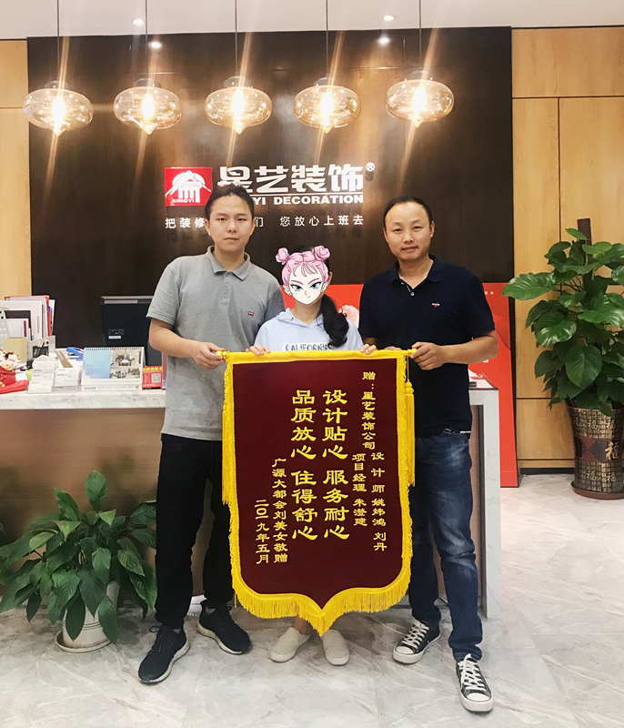 廣源大都會(huì)業(yè)主劉女士為感謝項(xiàng)目經(jīng)理朱澄建和設(shè)計(jì)師姚煒鴻、劉丹,專程來到星藝富安居設(shè)計(jì)中心送錦旗,感謝項(xiàng)目經(jīng)理和設(shè)計(jì)師的認(rèn)真負(fù)責(zé)。錦旗內(nèi)容:品質(zhì)放心,設(shè)計(jì)放心,住得舒心,服務(wù)耐心。認(rèn)真工作一定會(huì)獲得認(rèn)可的,我們一定還會(huì)繼續(xù)努力提升自己的工作服務(wù)。