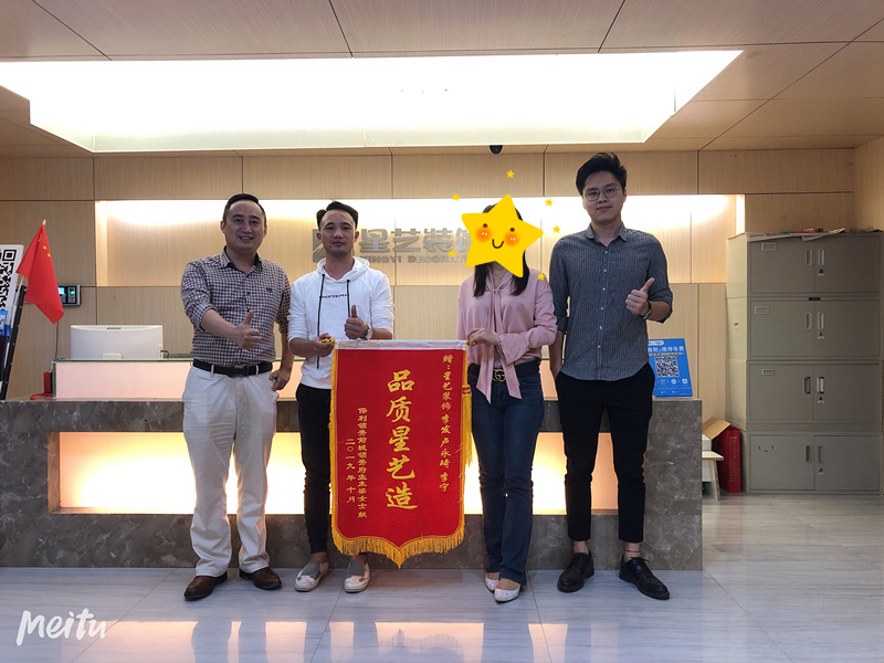 2019年10月25日,保利領(lǐng)秀前城的梁女士來(lái)到星藝裝飾集成整裝店面,親手贈(zèng)予星藝盧永琦 李發(fā)設(shè)計(jì)師 項(xiàng)目經(jīng)理李寧表示感謝的錦旗,錦旗內(nèi)容:品質(zhì)星藝造