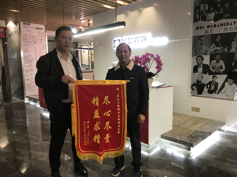 2019年12月24日,昌泰茗城的業(yè)主李先生來到星藝裝飾匯東店,親手贈(zèng)予易生教項(xiàng)目經(jīng)理錦旗表示感謝,錦旗內(nèi)容:精益求精 盡心盡責(zé)