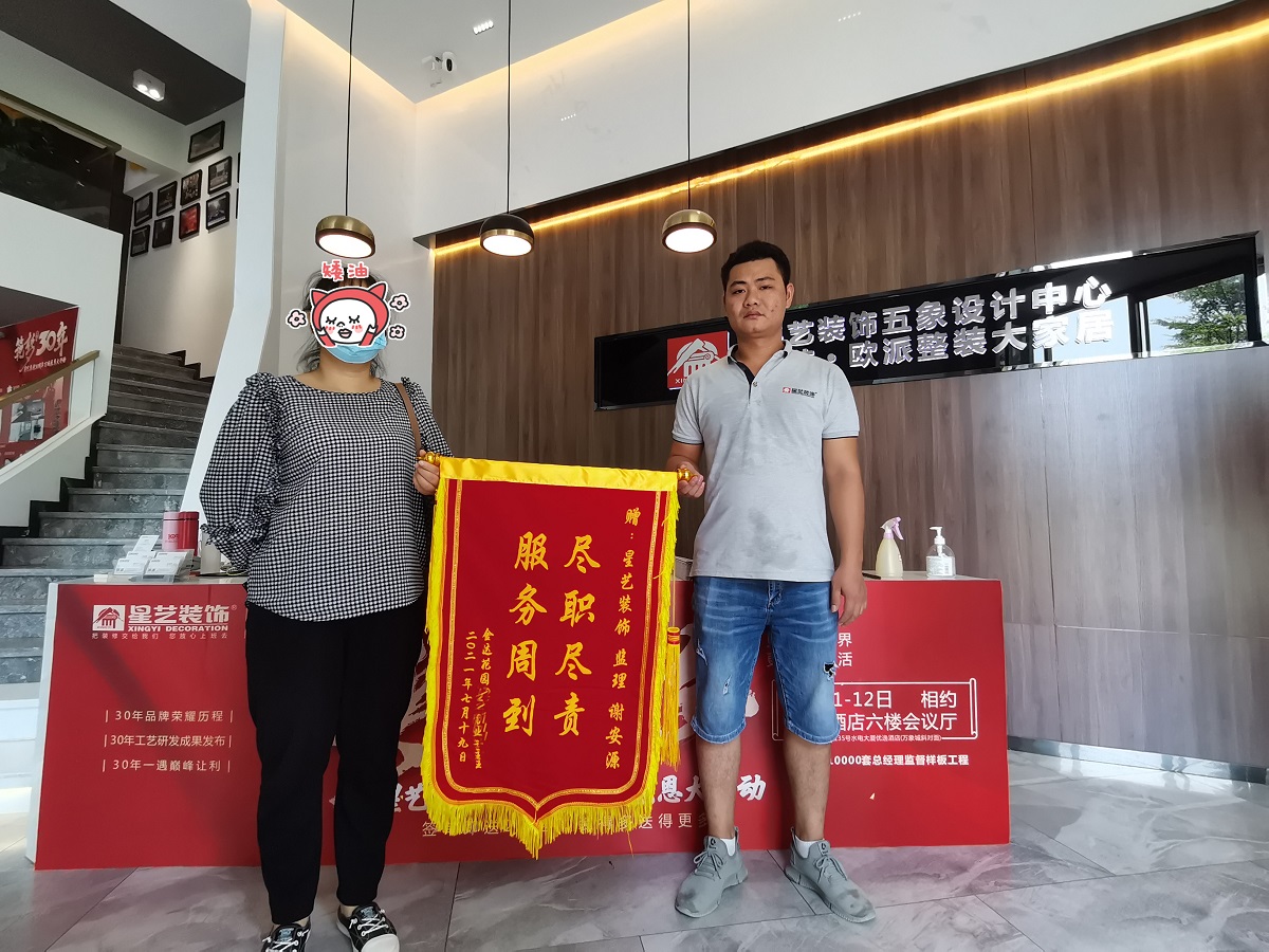 業(yè)主將大紅錦旗送到星藝裝飾五象設(shè)計中心,以感謝星藝裝飾工程監(jiān)理謝安源盡職盡責(zé),服務(wù)周到 ,這是對我們工作的極大認可和肯定。在今后的工作中,我們將再接再厲,堅持做客戶口碑,打造出更多的“精品工程”、“放心工程”,來回報我們的客戶。