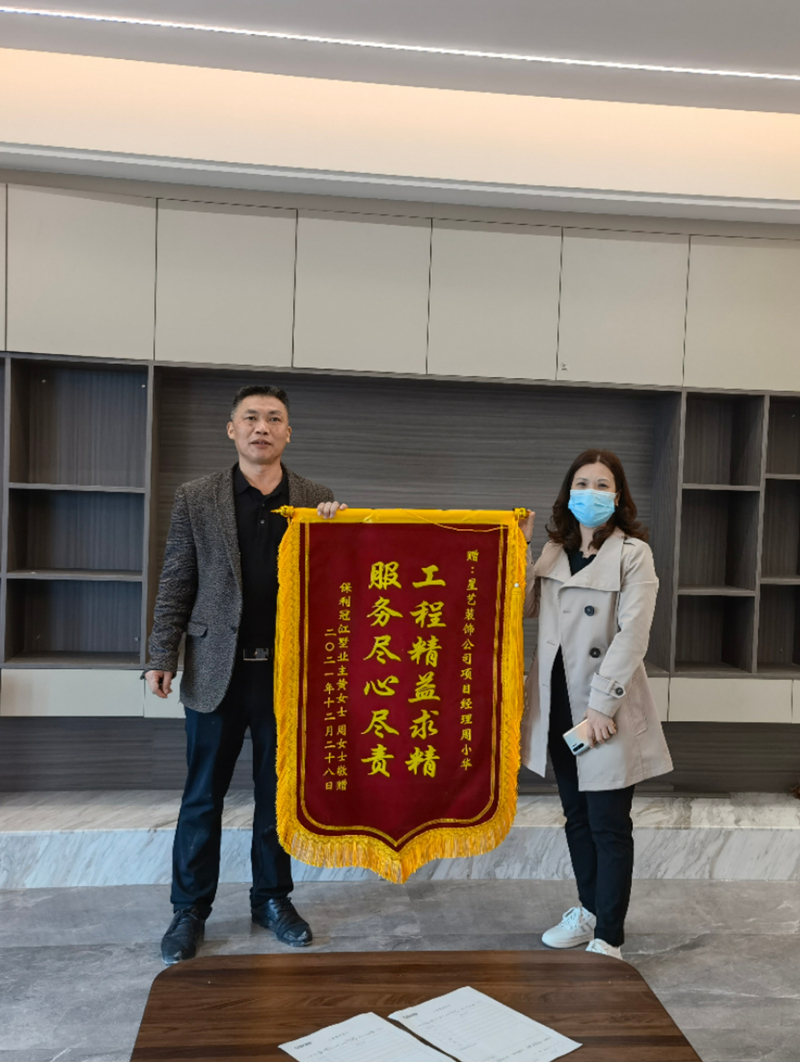 2022年元旦過后,來自保利冠江墅業(yè)主將一面印有“工藝精益求精,服務盡心盡責”的大紅錦旗送到星藝裝飾,以感謝星藝裝飾的裝修質量和服務。