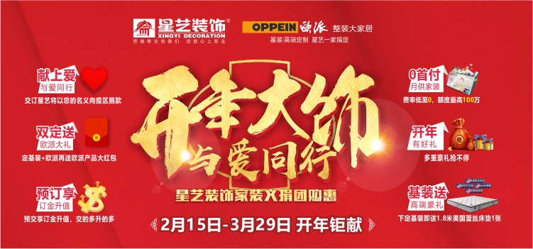 新冠肺炎疫情牽動著每一個星藝人的心,一方有難,八方支援,全國星藝人開啟集團發(fā)起的“愛心接龍。連日來,星藝全國眾多單位積極捐款,星藝員工自愿捐款,甚至星藝客戶也通過“愛心接龍”捐款,截止 2 月 10 日已籌善款 205 萬元……首批 50 萬個醫(yī)用外科口罩和 1 萬個醫(yī)用防護(hù)口罩已定向捐助到相關(guān)醫(yī)院,并獲得了人民日報的報道肯定,危難之時見真情,星藝奉獻(xiàn)有大愛。同心抗疫,為愛前行!星藝南寧分公司特推出開年大飾,與愛同行,家裝義捐團購惠裝修活動,具體優(yōu)惠如下: