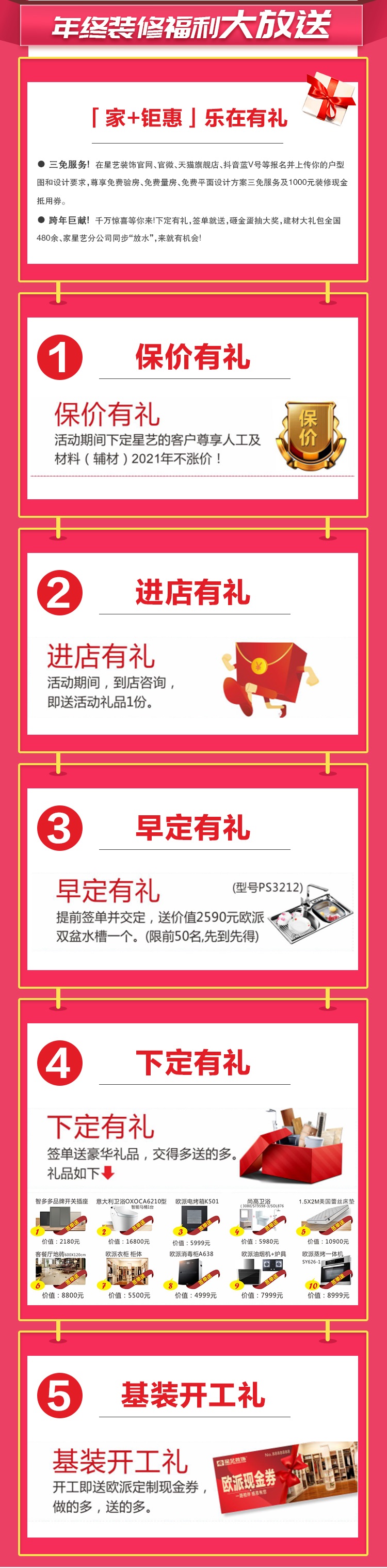 材料環(huán)保/運輸政策嚴格管控,材料上漲、人工上漲導致裝修成本年年高。為減少業(yè)主裝修煩腦,南寧星藝裝飾回饋廣大新老客戶,按集團總部統(tǒng)一部署,星藝裝飾南寧舉行2020年“跨年盛惠.保價裝修”全國跨年鉅惠大聯(lián)動活動,給八桂裝修業(yè)主帶來一場保質(zhì)更保價的高品質(zhì)家裝盛會。本次活動星藝特別承諾:活動期間下定,2021年裝修享2020年單價等以下多重好禮鉅惠,具體優(yōu)惠細則如下: