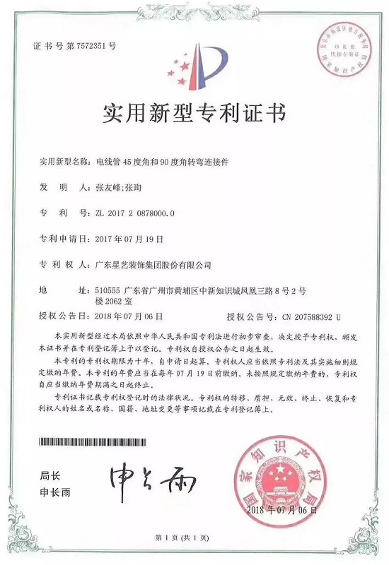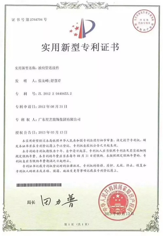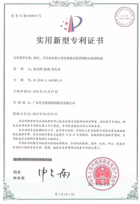 答:星藝裝飾中國建筑裝修裝飾工程專業(yè)承包壹級企業(yè),同時也首創(chuàng)“裝修質(zhì)量錘宣言”--讓工地開口說話!而且星藝裝飾還研發(fā)出“窗臺大理石防水結(jié)構(gòu)”“波紋管連接件”“電線管45度角和90度角轉(zhuǎn)彎連接件”等近30項國家實用新型專利和外觀設(shè)計專利。這些工藝通過每位星藝人的不懈努力不斷研發(fā)環(huán)保創(chuàng)新型工藝至今已推出近30項自主研發(fā)改良的專利技術(shù),接下來展示部分專利: