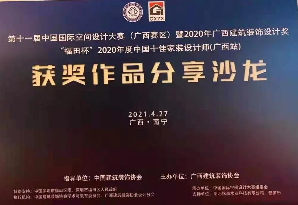2021年4月27日,第十一屆中國國際空間設(shè)計大賽(廣西賽區(qū))暨2020年廣西建筑裝飾設(shè)計獎“福田杯”2020年度中國十佳家裝設(shè)計師(廣西站)在廣西南寧南湖名都大酒店三樓舉行。來自廣西各單位的設(shè)計師和獲獎者齊聚一堂,用設(shè)計詮釋藝術(shù)空間,展示最好、最優(yōu)、最新的設(shè)計成果。
