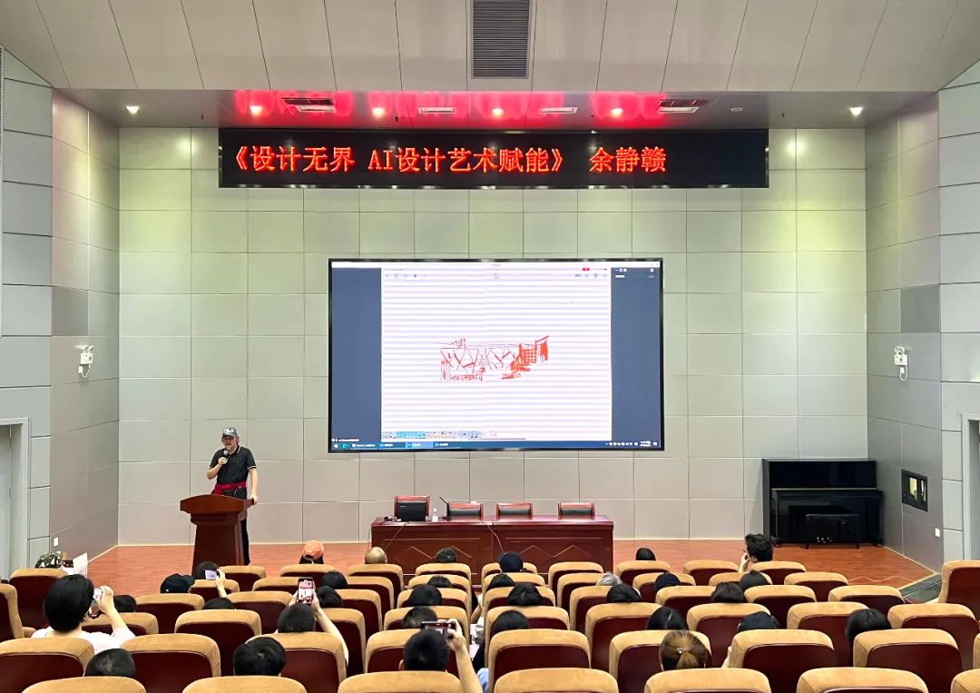 在現場,深耕設計行業(yè)三十多年、被譽為“家裝之父”的余工就“設計無界 AI設計藝術賦能”的主題進行授課持講,余工結合自身多年設計工作經驗以及游歷中外名地的感悟向現場師生分享了自己對設計藝術的理解,闡述自己從“有”到“無”的設計理念,并結合當下最流行的AI智能進行實操繪畫,向現場師生們展現了智能AI對設計藝術賦能效果,余工以深厚的手繪功底和與時俱進的學習精神贏得現場師生陣陣熱烈的掌聲。