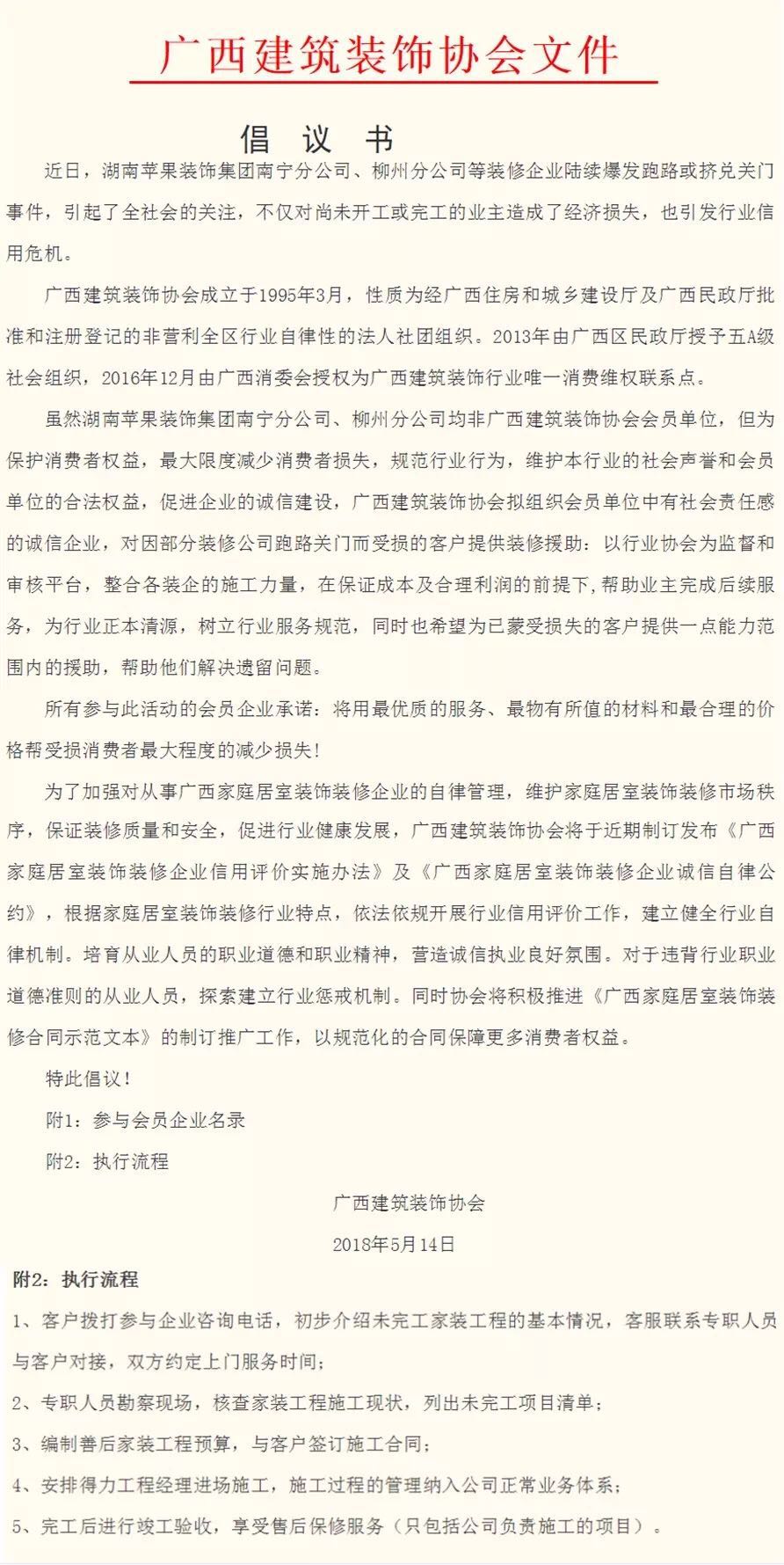 不僅如此,會(huì)上還發(fā)起行業(yè)倡議援助受損消費(fèi)者。星藝南寧積極響應(yīng)廣西建筑裝飾協(xié)會(huì)以及廣東星藝集團(tuán)的號(hào)召:在業(yè)主自行負(fù)擔(dān)成本的前提下,為受損業(yè)主提供幫助。用優(yōu)質(zhì)的服務(wù)、合理的價(jià)格完成受損業(yè)主的后續(xù)工程,最大程度減少損失!